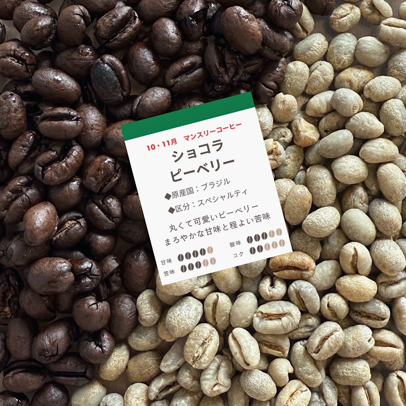 10・11月限定! monthly coffee 丸くて可愛いピーベリー まろやかな甘みと程よい苦み ⚫︎原産国:ブラジル ⚫︎区分:スペシャルティ ⚫︎精製方法:ナチュラル 甘味★★★★☆ 酸味★★★☆☆ 苦味★★★☆☆ コク★★☆☆☆ コーヒー豆は通常、1つの果実の中で2つできることが多いですが、 1つしか成長しなかった場合、丸い形のピーベリーが出来ます。 プレミアムショコラに比べ、 若干甘みの主張を感じることができ、ミルクとの相性も◎